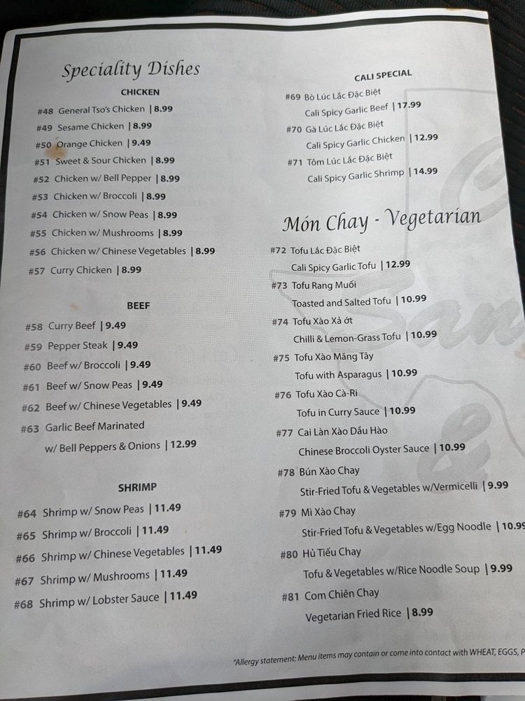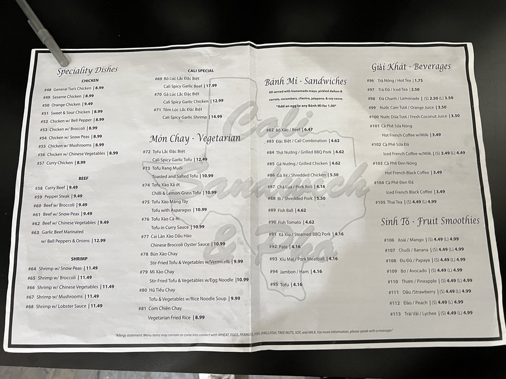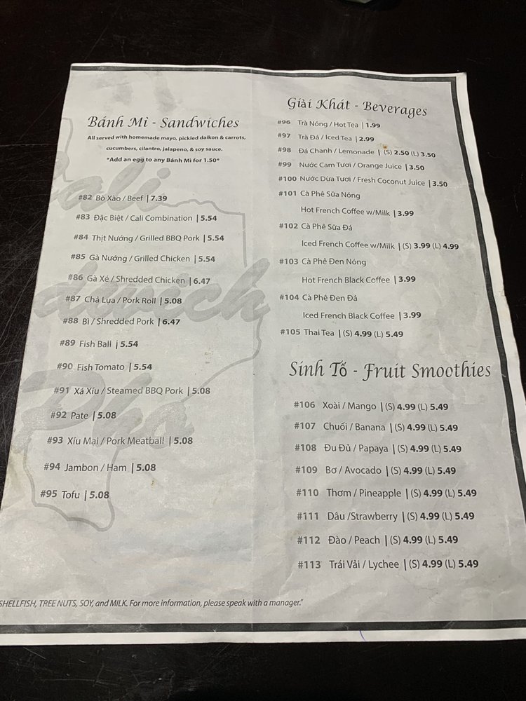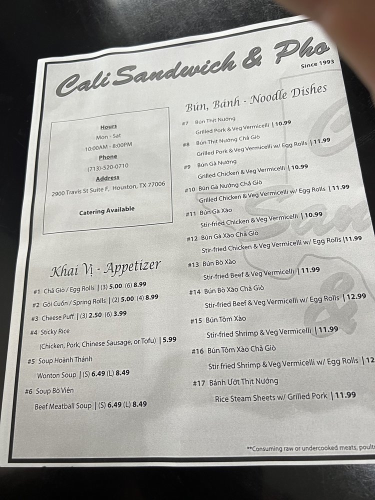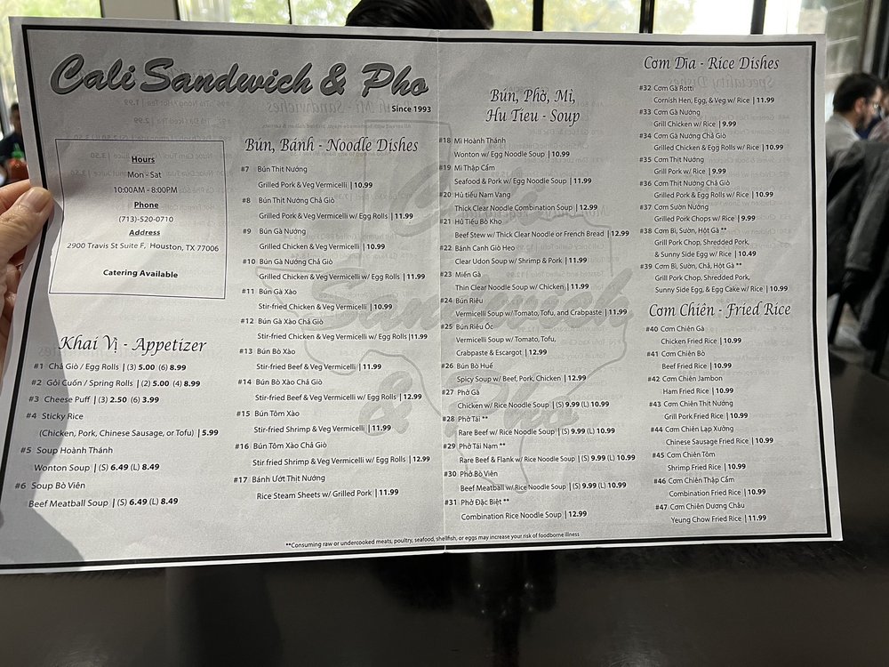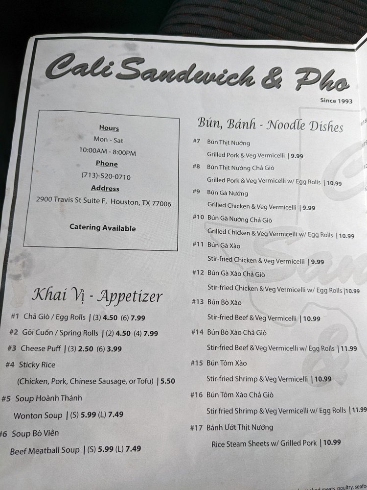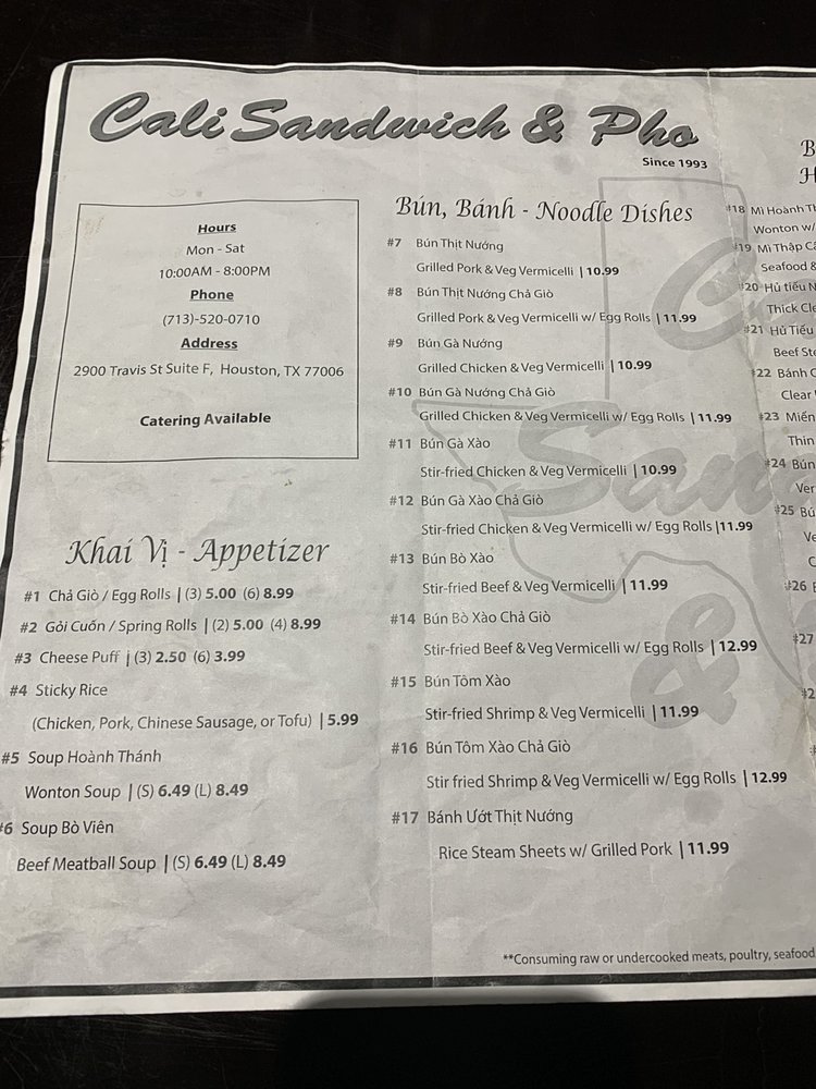 Introducing Cali Sandwich & Pho, a popular Houston staple known for their affordable and tasty Vietnamese eats. Located at 2900 Travis St Ste F, this casual eatery offers a range of options including delivery, takeout, and reservations. With a menu featuring vegan and vegetarian choices, as well as classic dishes like banh mi and pho, there's something for everyone to enjoy. Customer reviews rave about the flavorful egg rolls, crispy bahn mi sandwiches, and delicious pho broth. The service is fast, the ambiance is casual, and the pricing is budget-friendly. Don't miss out on the opportunity to savor the authentic flavors and generous portions at Cali Sandwich & Pho.